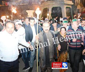 मशाल जुलूस में प्रदेश कांग्रेस कमेटी की अध्यक्ष एवं सांसद प्रतिभा सिंह, सभी कैबिनेट मंत्री, विधानसभा उपाध्यक्ष विनय कुमार, मुख्य संसदीय सचिव, विधायकगण, विभिन्न पार्टी पदाधिकारी, नेता और कार्यकर्ता शामिल हुए।
