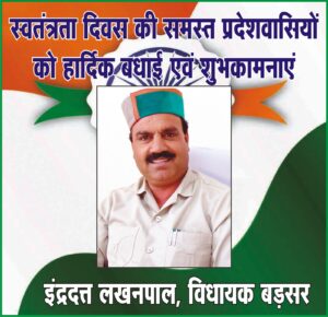 बड़सर विधायक इंद्रदत्त लखनपाल की ओर से समस्त प्रदेश वासियों को 79 वें स्वतंत्रता दिवस शुभकामनाएं!