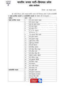 हिमाचल प्रदेश भाजपा ने नई प्रदेश कार्यकारिणी की घोषणा की है