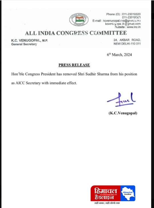 बागी विधायक सुधीर शर्मा से छिना AICC का सचिव पद, हाईकमान ने लिया कड़ा संज्ञान