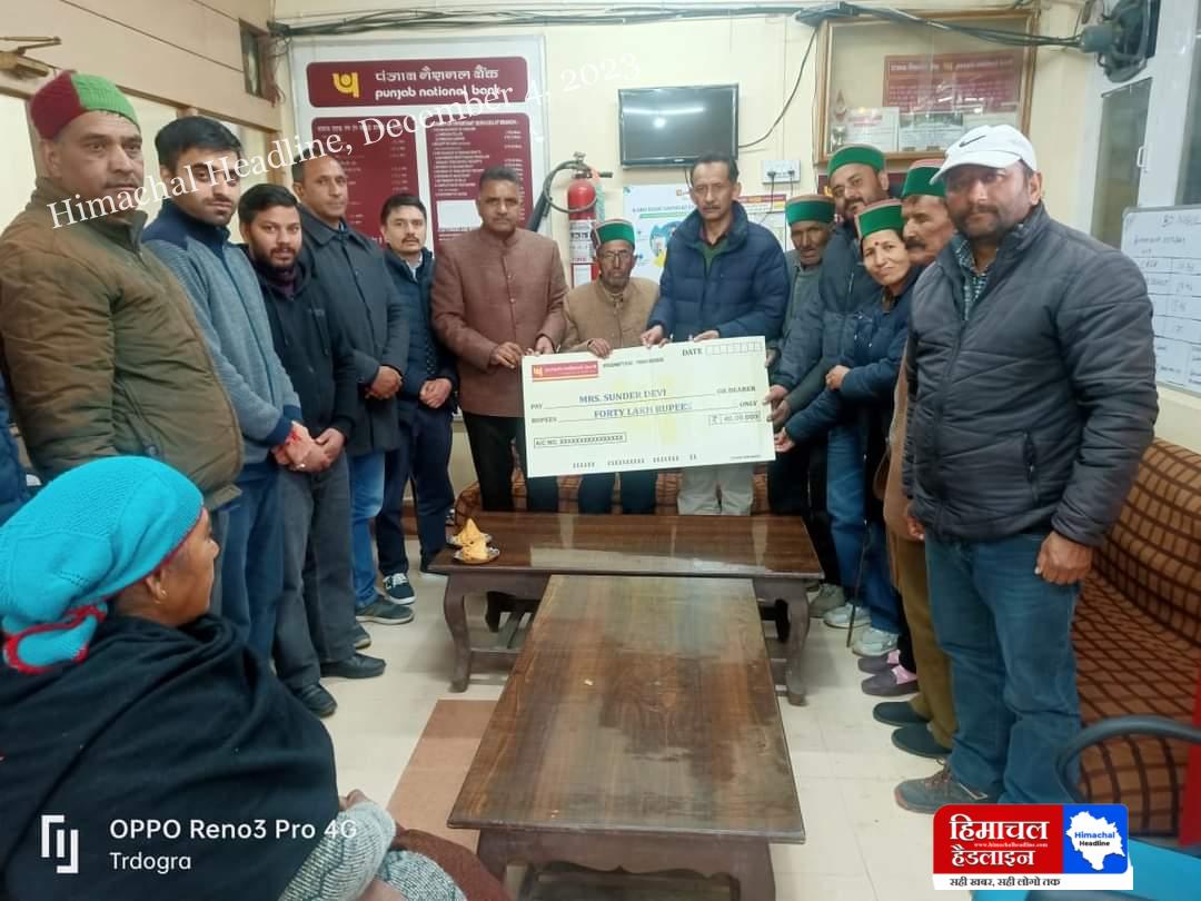 पंजाब नैश्नल बैंक की वेतन बचत खाता योजना के तहत किन्नौर जिला की सुंदर देवी को 40 लाख रुपये का चैक दिया गया