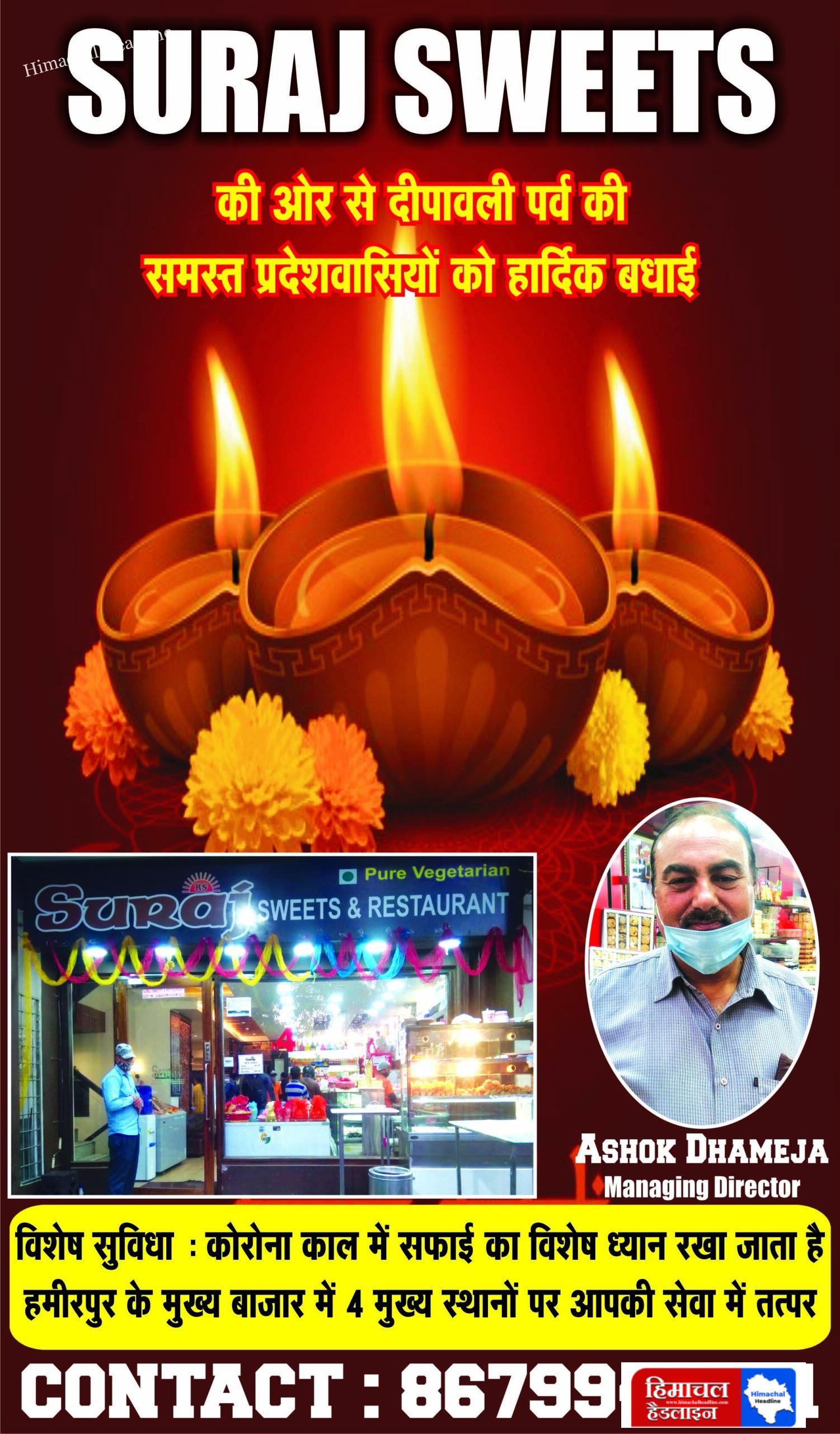 Read More » सूरज स्वीट शॉप हमीरपुर अशोक धमीजा की ओर से समस्त प्रदेश वासियों को दीपावली की हार्दिक शुभकामनाएं! 🌟