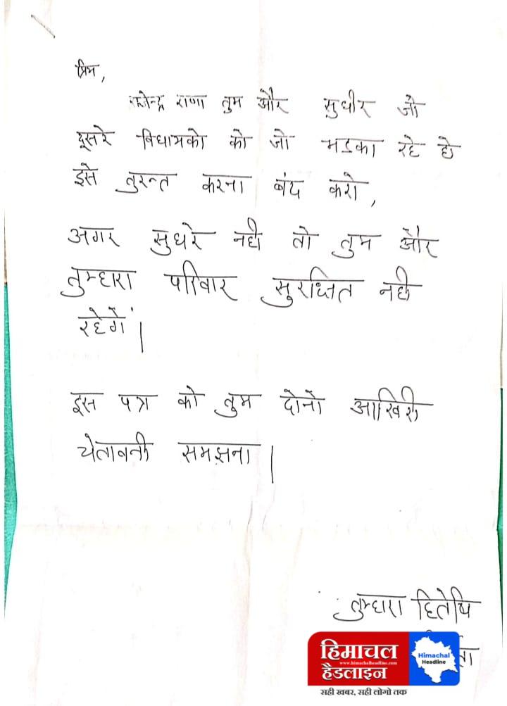 सुजानपुर के पूर्व विधायक और सुधीर शर्मा को मिली धमकी वाला पत्र मिला