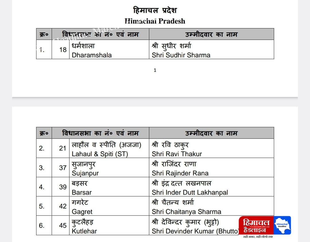 शिमला बीजेपी की केंद्रीय चुनाव समिति ने विधानसभा उपचुनाव के लिये उमीदवारों का ऐलान किया