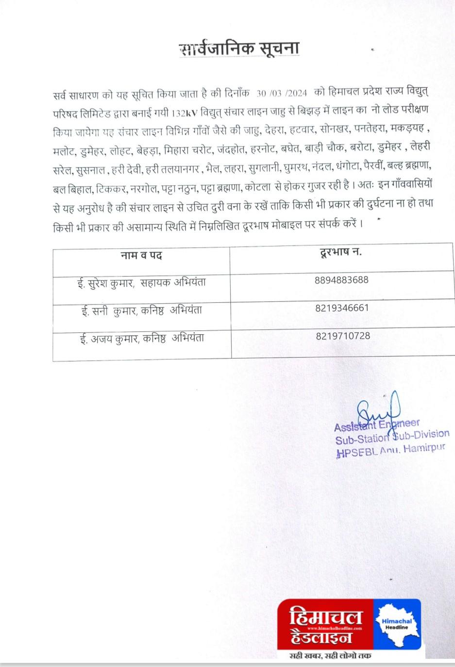 132 केवी लाइन की टेस्टिंग 30 को, सावधान रहें क्षेत्रवासी