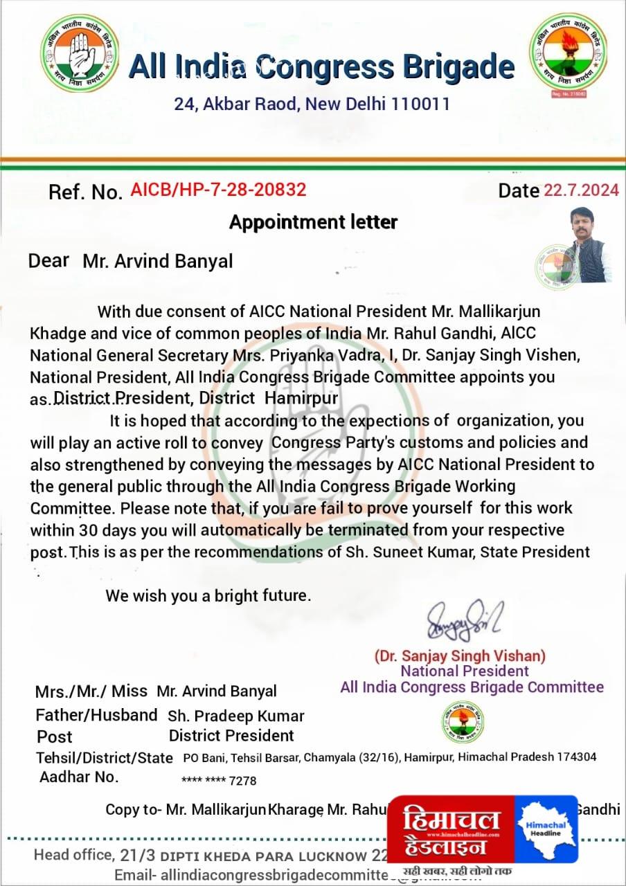 अरविंद बन्याल बने अखिल भारतीय कॉंग्रेस ब्रिगेड के जिला अध्यक्ष