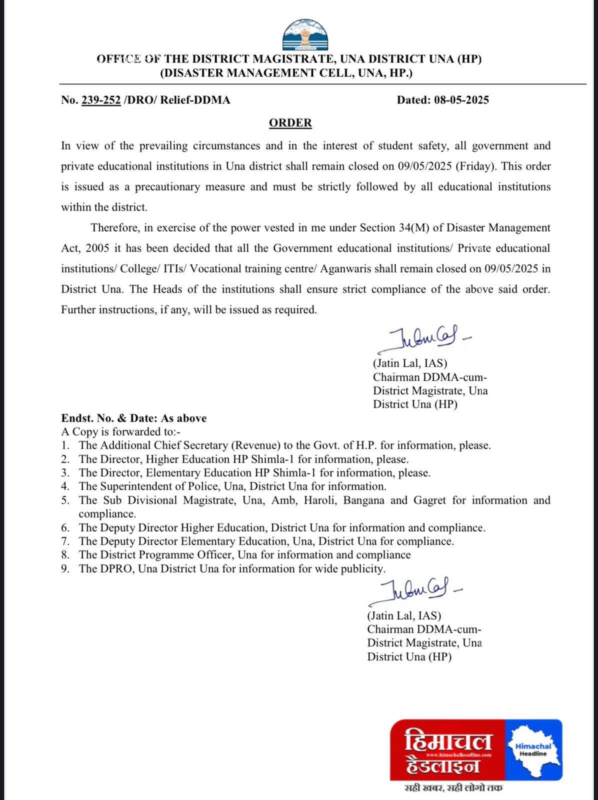 जिला ऊना में शुक्रवार को सभी सरकारी व निजी शिक्षण संस्थान बंद, डीसी ऊना ने जारी किए आदेश।